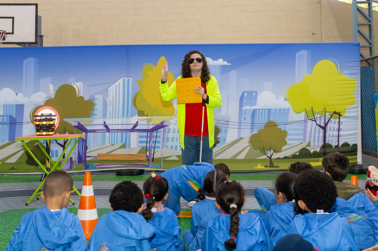 A seguir, as crianças atuaram na simulação de uma cidade em funcionamento. Os atores interpretaram agentes de trânsito, semáforo, pedestre, idosos, deficientes visuais, motorista e demais elementos presentes no cotidiano das cidades.